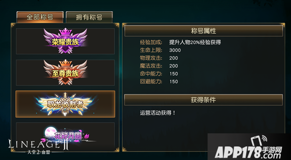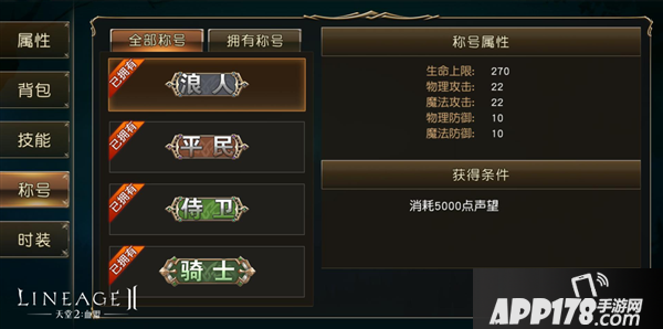 所有的称号都有着不同的获得条件,例如爵位称号,就需要消耗一定量的声望提升爵位方可获得。