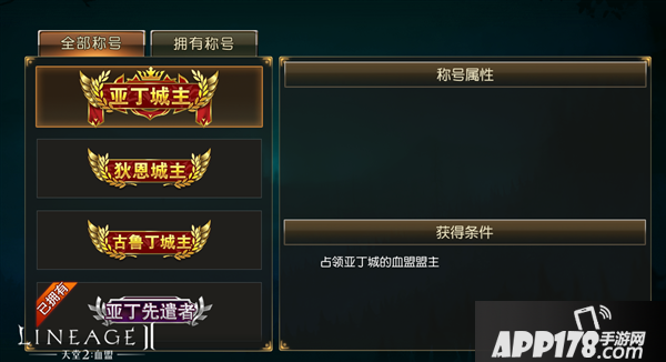 占领亚丁、狄恩和古鲁丁三个城池其中之一的血盟盟主可以获得无上的荣誉——城主称号。