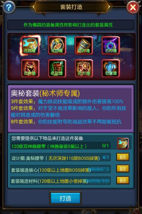 合成职业套装需要对应等级的双属性神器装备、套装部位设计图、套装锻造核心和套装锻造材料。而这些合成装备的材料则分布于120级以上的地图小怪、BOSS,以及无尽深渊的BOSS之中。