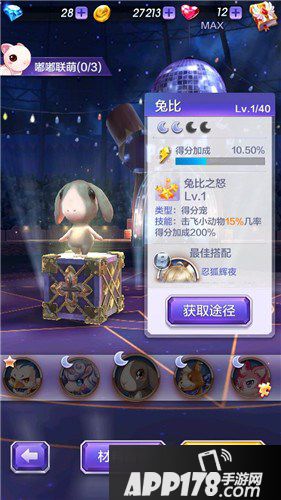 兔比是嘟嘟联萌的三位成员之一,为月亮二阶的得分宠,初始等级最高可以升至40级。技能方面,触发技能虽然同样是看几率,但是相比喵喵小狸高太多,最重要的是得分的加成是200%,不过在前期的一些模式中,小动物并不多,使用起来会比较局限。