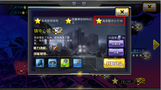 天天的小伙伴们,咱们又见面了~ 话说天天枪战改版之后,三星评价变了花样,不再是之前版本的由过关剩余血量这一单一数据来判定星级,而是不同的关卡有不同的三星条件,必须同时达到这三个条件才能 获得三星评价!小编我是个有强迫症的人,看着那灰色的星星就有抓狂的赶脚有木有~~三星条件有的是硬卡,比如多少多少时间内通关,小编只能说:“努力升级 强化装备提高战力或者像土豪一样抽把牛X的枪支然后碾压关卡吧!”但是有的三星条件就是技巧型的,比如-----连杀!