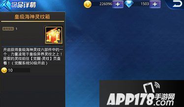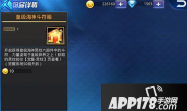 皇级海神斗符箱开启后直接获得皇级海神灵纹六部件中的斗符,力量凌驾于皇级异界之上!斗符是灵纹六部件中力量最强且最难获得的一个,现在只需98个钻石就有几率获得。