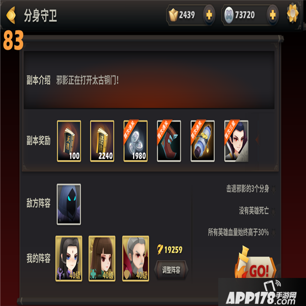 分身守卫副本推荐使用群伤爆发英雄,小编这副本使用的组合是经典的“战法牧”式组合——老将定勇、小神婆甘草,和大荒枭雄玉玑子。
