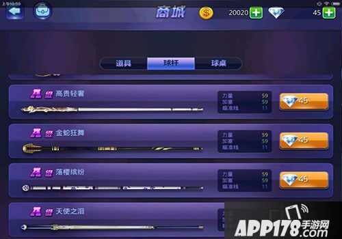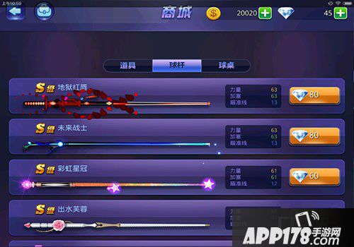 进入到商城,第一个进入我们眼睛的就是一根根漂亮的球杆,球杆也是分等级的,其中S级的球杆最好,不仅从外观上看起来是非常的绚丽,而且还有一些额外属性的加成哦,大家在打球的时候什么最重要,当然是准星和力度,这些通通都有加成,还不赶紧去买一个。