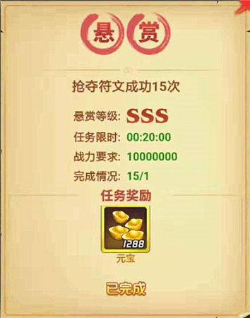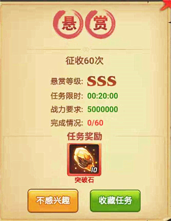 SSS级任务的完成条件,包括抢夺符文成功15次、征收60次、进行平定叛乱10次、进行3次寻访、升级武将技能20次、任意武将进阶5次等,想完成SSS级任务的玩家,最好先计算好有无相应的次数。升级武将技能和进阶武将可以选择绿色武将进行,节省资源。