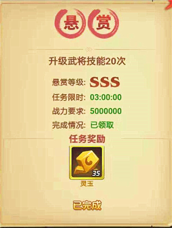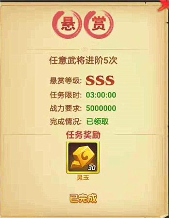完成悬赏任务的条件基本都是游戏里大家熟悉的玩法,比如兑换经验值、兑换铜币、升级武将、进阶武将、升级装备、精炼装备、完成平定叛乱等等。而奖励包括元宝、进阶石、突破石、宝石、平叛令、铜币、武将经验等。