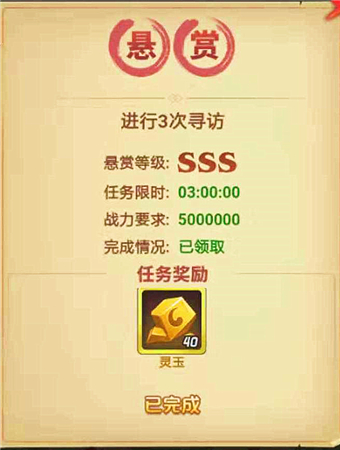 首先查看悬赏任务需要翻阅县志,点一次出现一个任务,用完次数后每次都要花费10元宝。发布的任务最低为A级,最高SSS级,A级到SS级任务可直接刷出,SSS级任务从早上8:00到晚上0:00每隔两小时刷新一次,一次发布两个。