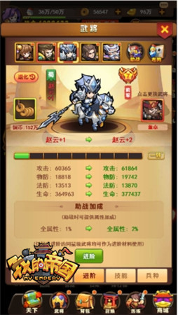 除了好友系统,想要在37《我的帝国》里提升战力,武将进阶玩法是个不错的选择。消耗未进阶的同星级武将,对目标武将进阶,可全面提升目标武将的属性,当武将进阶到达9阶后,可进行转生。转生后,武将成为真级或神级武将,战力随之会大大提高。