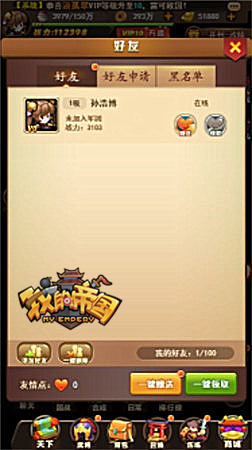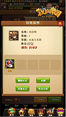 37《我的帝国》的玩家可以在好友系统添加好友,若点击好友头像,还可以查看好友的排兵阵容,了解武将的新排兵“姿势”,学习一下大神们的排列阵法,与好友发起私聊,可以更快地交流经验,此外,你还能赠送或领取好友的威望值,威望值在游戏里可是一个十分关键的材料!