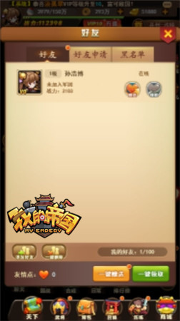37《我的帝国》的玩家可以在好友系统里添加好友,添加完毕后,可点击好友头像,查看好友的排兵阵容,了解武将的新排兵“姿势”,与好友发起私聊,更可以更快地交流经验,好友系统乐趣多多,快邀请小伙伴来一起征战吧!