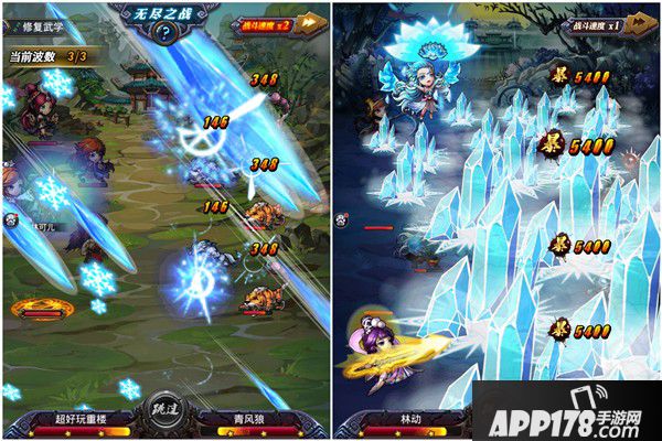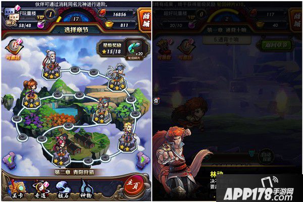 本作的战斗玩法并无太多称赞的亮点,手指点击屏幕让角色在横版地图上冒险,每到一节点就会获得资源奖励,在副本的终点则会遇到关卡头目,战斗打响。战斗前的策略阵型布局就是最大的玩法,7个角色(前3后4)大多遵循肉在前,输出在后。完全自动的回合制战斗,也没有留下太多操作余地的空间,说到底还是考验玩家对角色的培养程度。不过,游戏在视觉效果上还是下了番功夫,主要角色(含配角)的技能特效都充斥全屏,触发羁绊的合体技更是狂拽酷炫,加上每一次对应角色都会念出技能招式来,还真有几分小说里主人公战斗的即视感。