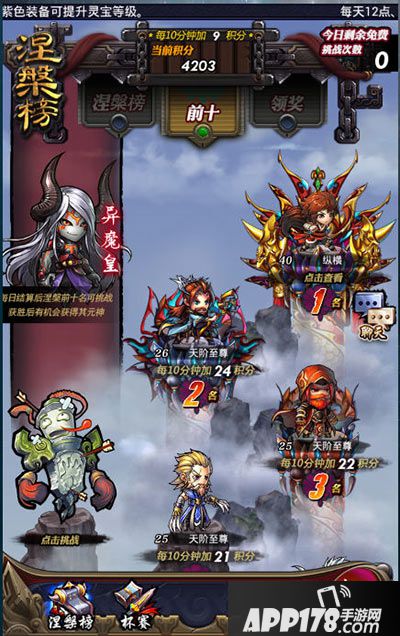 挑战涅槃榜的玩家提升排名,可根据排名的高低,持续获得不同的涅槃积分奖励(每10分钟增加一次积分奖励)。实力超群的高排名玩家对应超高积分奖励,玩家通过涅槃积分可兑换轮回碎片,凭借轮回碎片收集心爱的伙伴。涅槃榜前5的玩家还可额外获得击杀“异魔皇”权限,击败异魔皇可获得元神奖励,助你达到更高涅槃境界,握生死,掌轮回。