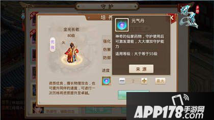 守护的培养也是不用花钱的,守护培养需要消耗“元气丹”。培养后能够提升守护的攻击与防御。而元气丹也并不是付费道具,玩家可以通过声望直接兑换,只要每天坚持刷帮贡,或者参与竞技场就可轻易获得元气丹了。