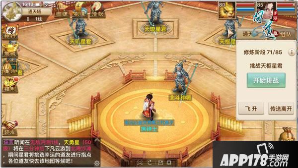 进场后就会被一大群的星君包围着,不用害怕,因为你只需要成功挑战其中的一个NPC就可以进入下一层了。点击开始挑战可自动寻路至相应的挑战NPC,并且进入挑战。通天塔的难度是比较高的,经常一不小心就会歇菜,各位道友在参与战斗的时候,还需要多注意策略的安排。例如星君死了后,宝宝总是会给星君拉血,那么我们就可以尝试下集火宝宝,再打星君。每进入下一层挑战,星君的难度都会增加,总之通天塔的活动还是挺有挑战性的。