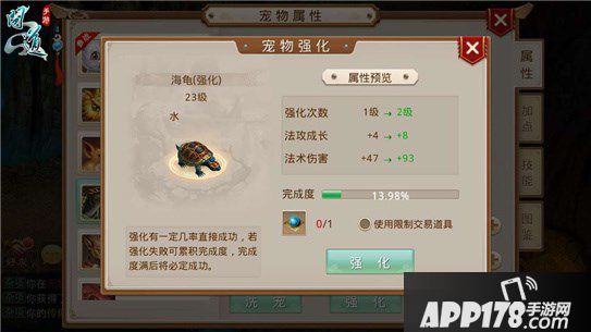 宠物强化也是宠物培养的一个重要部分,在人物等级达到65级之后开放宠物强化功能。强化之后宠物的部分成长和属性会有非常长足的进步,宠物也因此变得十分强大。相比于端游来说,现在宠物强化十分简便,只需要使用“宠物强化丹”便可对宠物进行强化,“宠物强化丹”可以在商城里进行购买,强化有几率直接成功,失败了也会累加一定的强化完成度,完成度满了之后必定成功。目前来说,宠物的强化次数上限为12次,比如要强化宠物的法攻成长,则宠物的法攻成长最多只能强化12次。强化之后宠物的后缀变为(强化),十分酷炫。
