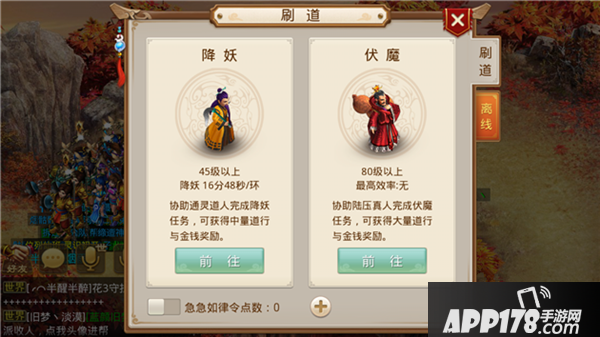 我们刷道一共有两种方式,降妖和伏魔。降妖在等级达到45级之后就可以进行了,伏魔需要等级达到80级以后才能进行。