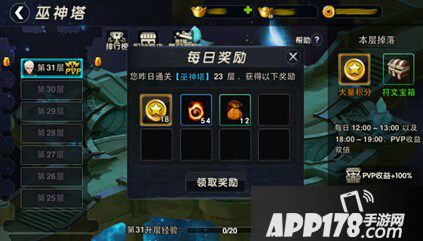 巫神塔每日凌晨会自动发放一次层数奖励,昨日0:00前玩家所在层数越高,可领取的奖励就越多(人物等级超过70之后,就没法再获得了)。对的,也就是今天领的是昨天战果的回报,每日奖励大概是长成这个样子——
