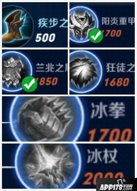 疾步靴,阳炎铠甲,冰拳,兰兆之盾,狂徒之心,冰杖