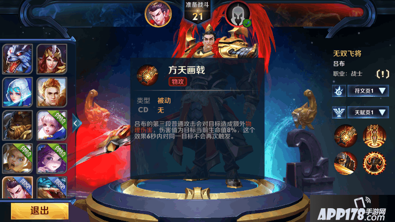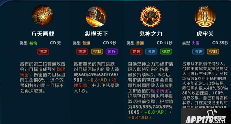吕布从不畏惧任何敌人, 召唤出虎牢关竞技场与敌 人们进行生死决斗,竞技 场持续S秒期间坜内的敌 人不能正常走出竞技场, 降低场内敌人40%/So%/ 60‰攻击速度、100% 治疗效果,自己获得霸仲 状态,并在竞技场出现时 对他们造成S00樁00"0 00.5AP魔法伤害