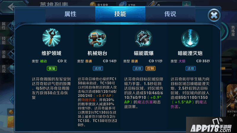 主动技能:大招暗能湮灭炮(达芬奇向目标区域召唤暗能炮,2.5秒到达区域,对区域内的敌人造成850/1100/1350+1.5*AP)的魔法伤害