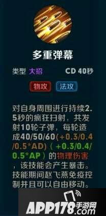 【多重弹幕】对前方扇形区域内的敌人进行持续2.5秒的疯狂扫射,共发射10轮子弹并造成物理伤害。该技能附带暴击效果,但暴击伤害降低了50%,期间免疫控制。