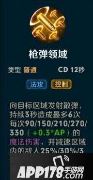 【枪弹领域】向目标区域发射散弹,持续3秒并造成魔法伤害,并降低区域内敌人的移动速度。