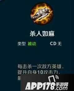 【杀人如麻】被动技能:每击杀1次敌方英雄,提升自身10攻击力,最多提升6次。