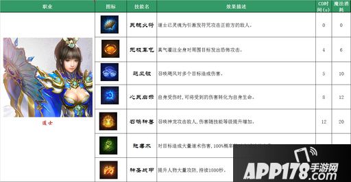 道士拥有【无极真气】和【施毒术】两个已自身为中心的伤害技能,前者施法后一段时间围绕在道士对敌方造成伤害,后者会对目标造成中毒效果和减速效果。