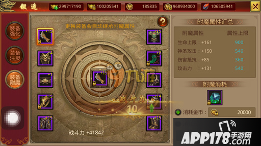 【装备附魔】装备附魔所需要消耗的道具材料为“翡翠灵石”,同时可以选择使用“金币”还是“元宝”进行附魔操作,区别在于使用金币会出现增加/减少附魔属性,使用元宝只会出现增加附魔属性一种情况,同时要提醒大家,点击“附魔”按钮后,要记住点击“保存”,这样附魔属性才会真实叠加,如果没有点击保存那就白白浪费材料了哦!