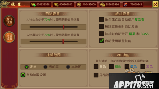 玩家可通过设置界面进入到挂机设置,其中的功能可以让我们更有效的体验游戏。