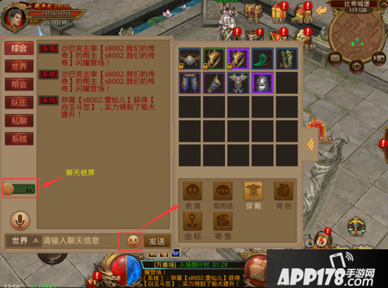 聊天定位晒装备:在聊天文本框中的笑脸,可以选择穿戴/背包/坐标等强大功能,交易炫富必备get技能。