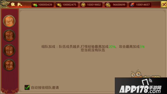 在任务按钮旁是“队伍”按钮,可以查看当前的组队状态。点击队伍按钮,可以开启组队面板成立队伍,游戏有组队加成BUFF,队伍成员越多,打怪经验/攻击加成越高。