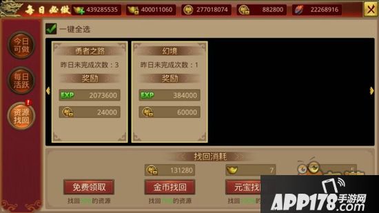 玩家通过资源找回可将游戏中很多日常产出点前1天未完成的内容,通过消耗金币或钻石进行找回,以免因一时无法上线损失掉一天的大量收益