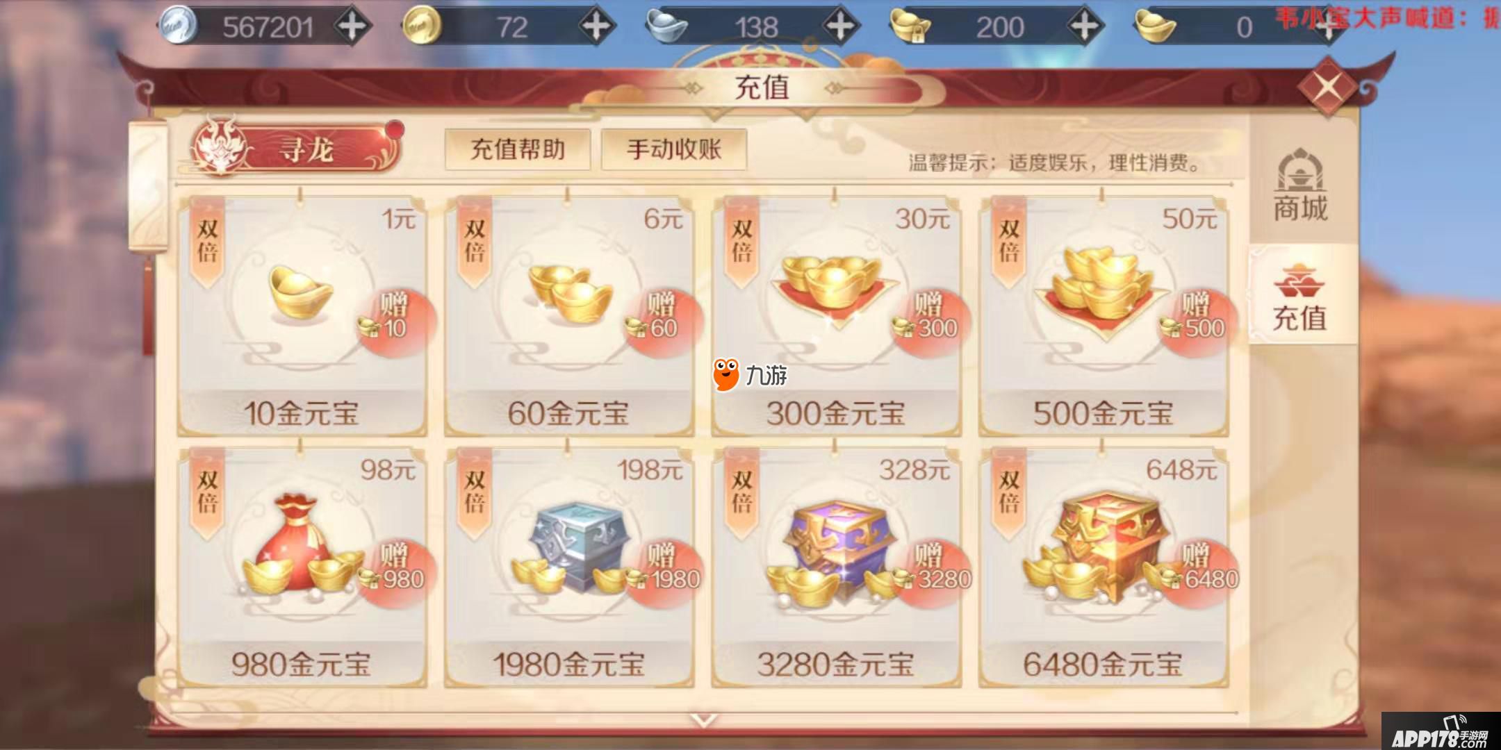 游戏中最普遍的货币,可以升级技能等,获得方式也是最多。完成游戏内任务包括副本、主线、支线任务等;金元宝、银元宝、金币兑换都可以获得;完成一定活跃度也可以获得银币。