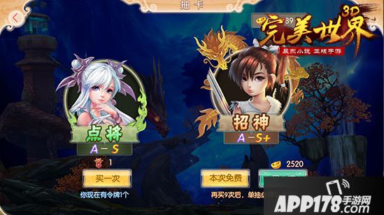 4. 招神: 点击游戏主界面右上【招募】按钮,进入招募系统界面后,采用元宝进行抽卡,每次随机抽取A - S+英雄。每两天有一次免费抽取的机会,免费抽取机会使用后,可使用280元宝抽一次,2520元宝抽十次。