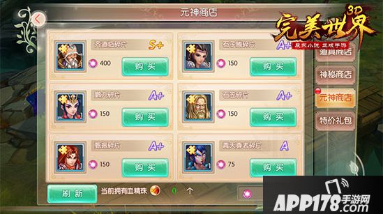 在元神商店中,可以使用元神值购买英雄碎片,元神值的获得途径为:售卖已获得的英雄碎片。