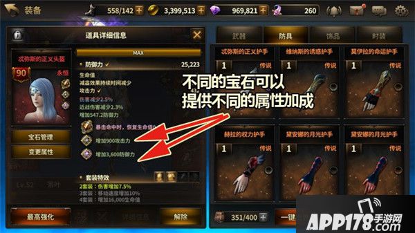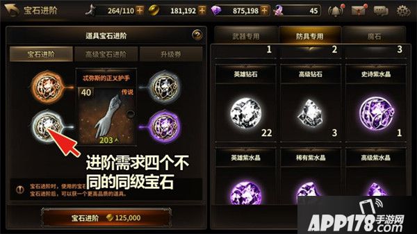 防具或者武器但强化到满级时可以同时使用四个不同颜色的同等级宝石进行定向进阶。如下图,使用四个不同颜色的传说宝石加上满级的忒弥斯的正义护手就可以获得一个永恒品质的忒弥斯的正义护手。