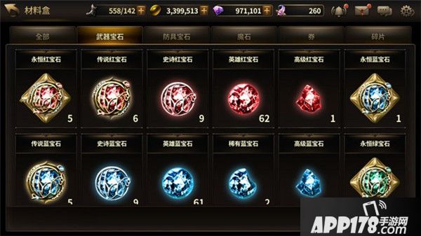 宝石可以分为武器宝石和防具宝石两个种类,点击进入游戏界面左下角的材料盒,可以查看你目前拥有的宝石。其中武器宝石有红宝石、蓝宝石、绿宝石、黄宝石四种,分别提高攻击力、攻速、暴击伤害、暴击率的属性加成。