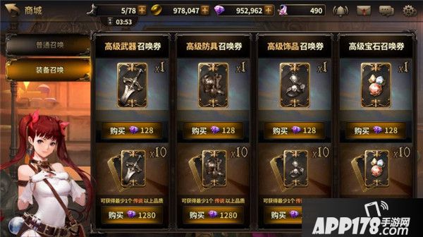 TIPS:装备召唤只能通过消耗钻石进行抽取,可消耗128或者1280钻石分别进行单次和十次召唤(会额外赠送多一次召唤,一共可以获得11件装备或者宝石),十连抽必定可获得最少一个传说以上品质的装备或者宝石,绝对不容错过哦!祝您把把十连出永恒!