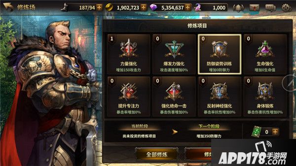 角色达到20级后就会开放修炼场系统,修炼场系统类似于属性系统,可以增加攻击、攻速及防御等8项生命属性,升级需要消耗金币或者修炼券。前期升级金币消耗非常少,可以说是最值的金币花费。