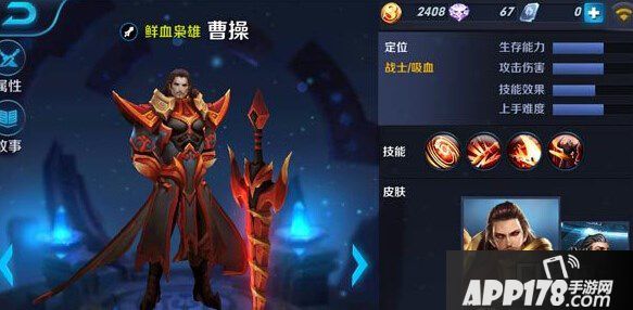 曹操是一名战士型英雄,他的技能比较全面,突进、吸血、减速全部包含,这让他可以在战场上先手开团,对敌造成伤害的同时通过吸血技能回复血量。来了解下曹操的技能。