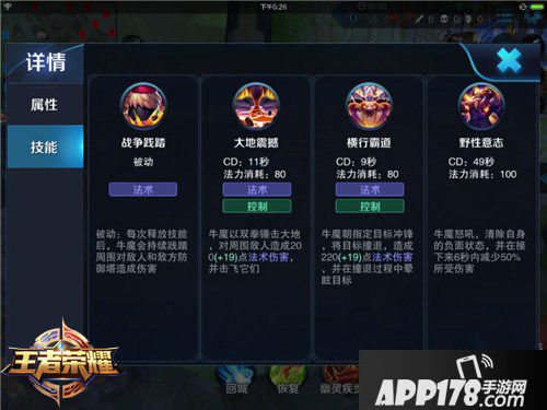 被动技——战争践踏:每次释放技能后,牛魔会持续践踏周围对敌人和敌方防御塔造成伤害