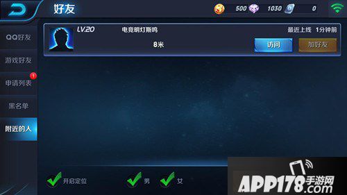 《王者荣耀》新版本中,全新社交功能即将开启。在好友界面中,新增附近的人功能,只需在界面中开启定位,即可搜索到附近上线玩家。一个人玩游戏很无聊,想约朋友一起开黑作战,但时间总是那么不凑巧,朋友们不是上班就是上学,等朋友有时间的时候,自己却忙得一塌糊涂。新版本全新社交功能来临,玩家可在游戏中,搜索到附近正在对战的玩家,添加好友,相约一起开黑对战。搜索到附近的大神,在游戏中抱个大腿,拿个躺赢妥妥的,如果自己实力超群,那还可以趁机秀一把操作,让附近的人都知道你就是他们附近的大神。