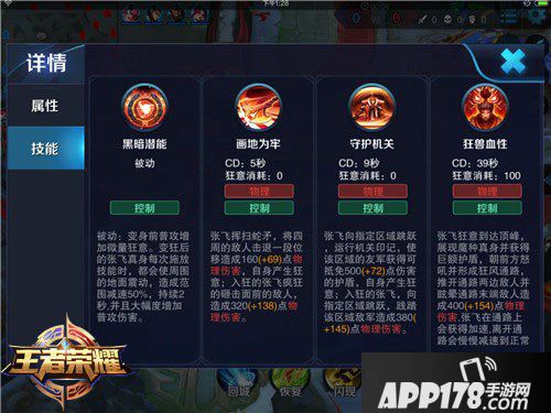 被动技——黑暗潜能:变身前普攻增加微量狂意。变狂后的张飞真身每次施放技能时,都会使周围的地面震动,造成范围减速50%,持续2秒,并且大幅度增加普攻伤害。