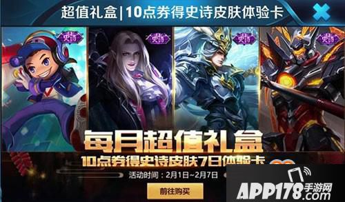 活动内容:每月超值礼盒,10点券得史诗皮肤7日体验卡!