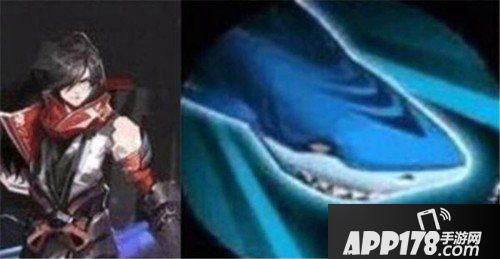 英雄的形象应该比较偏向青少年,黑色的长发和红色的围巾,右边是技能图标,看上去就是一条大白鲨,英雄的定位目前曝光是刺客主定位,使用双手魔道武器。