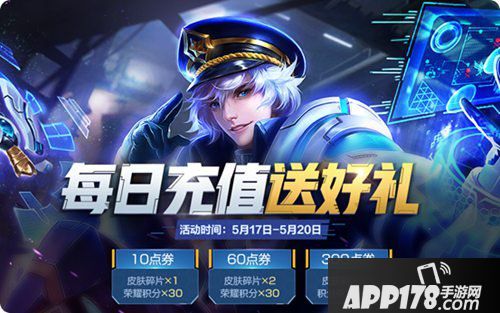 每日充值300点券可额外获得:皮肤碎片*6+积分夺宝抵用券*1+荣耀积分*60。