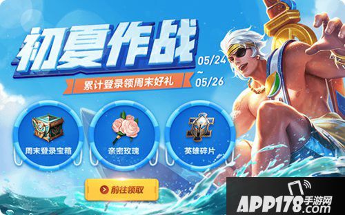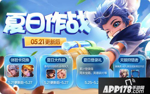 夏日已至,峡谷初夏作战开始,每日完成夏日对战活动有机会得永久英雄,新一轮的体验卡兑换已经开启(孙尚香-水果甜心,赵云-未来纪元等勇者皮肤等你免费体验),周末登录/对战更有英雄碎片等好礼相赠。