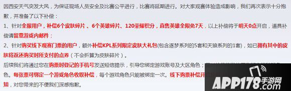 4、在官方渠道公开活动中抽中赠票的用户 ,也将获得游戏内KPL限定皮肤补偿 ,我们将尽快公布细则并主动联系。