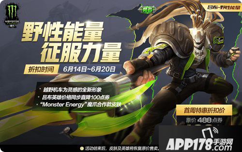 野性的能量,征服的力量。《王者荣耀》与“Monster Energy” 魔爪的合作款皮肤。极限运动风格的头盔加翎子设计,重装机车为灵感和夸张的轮胎造型。这就是吕布的全新皮肤:野性能量。